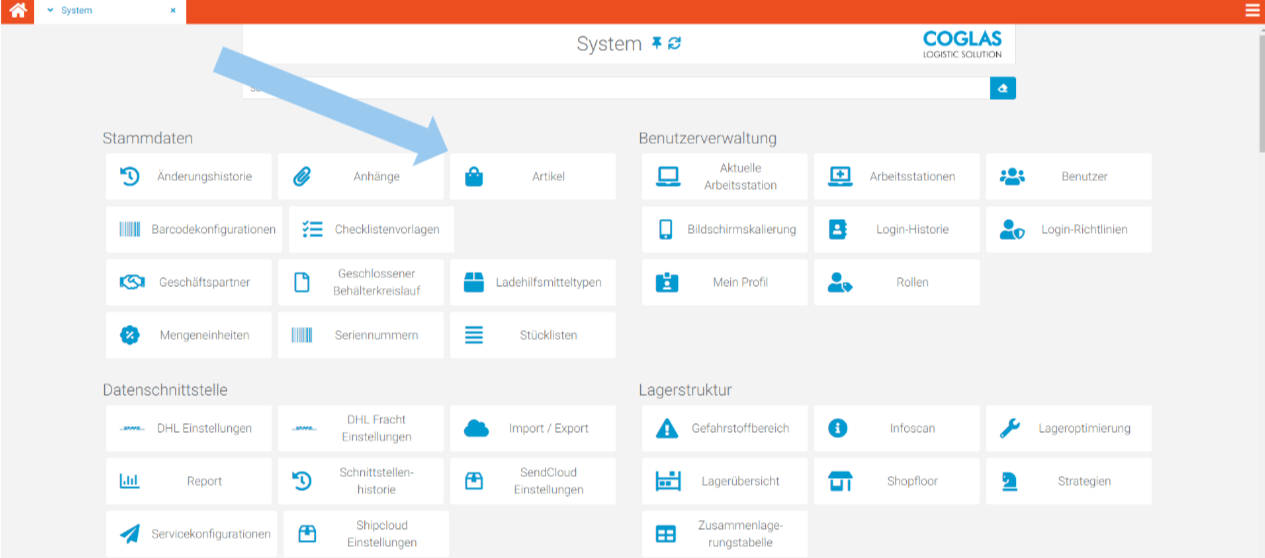 | 2 | Wählen Sie entweder aus dem Reiter Stammdaten oder nutzen Sie die Suchleiste, um „Artikel“ auszuwählen. | ![]() |