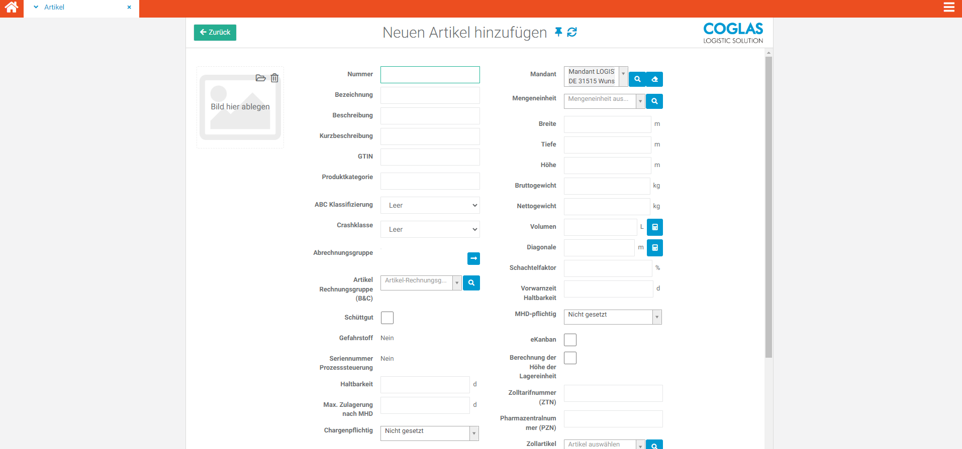 Sämtliche Artikel die Sie in ihrem Lager verwalten möchten müssen zuvor in COGLAS erfasst und die dazugehörigen Stammdaten eingetragen werden. Die Artikel können entweder manuell oder über eine Schnittstelle hinzugefügt werden.