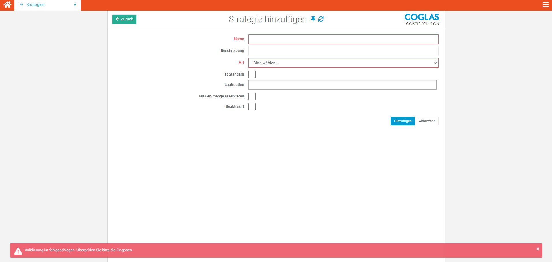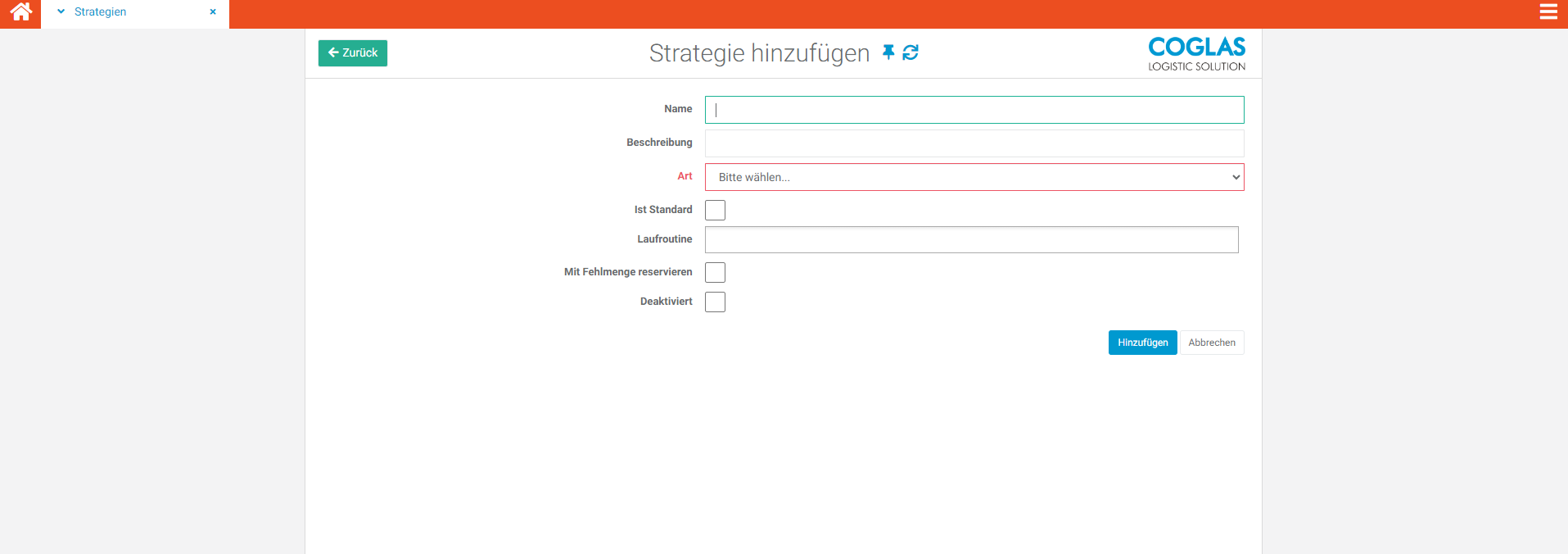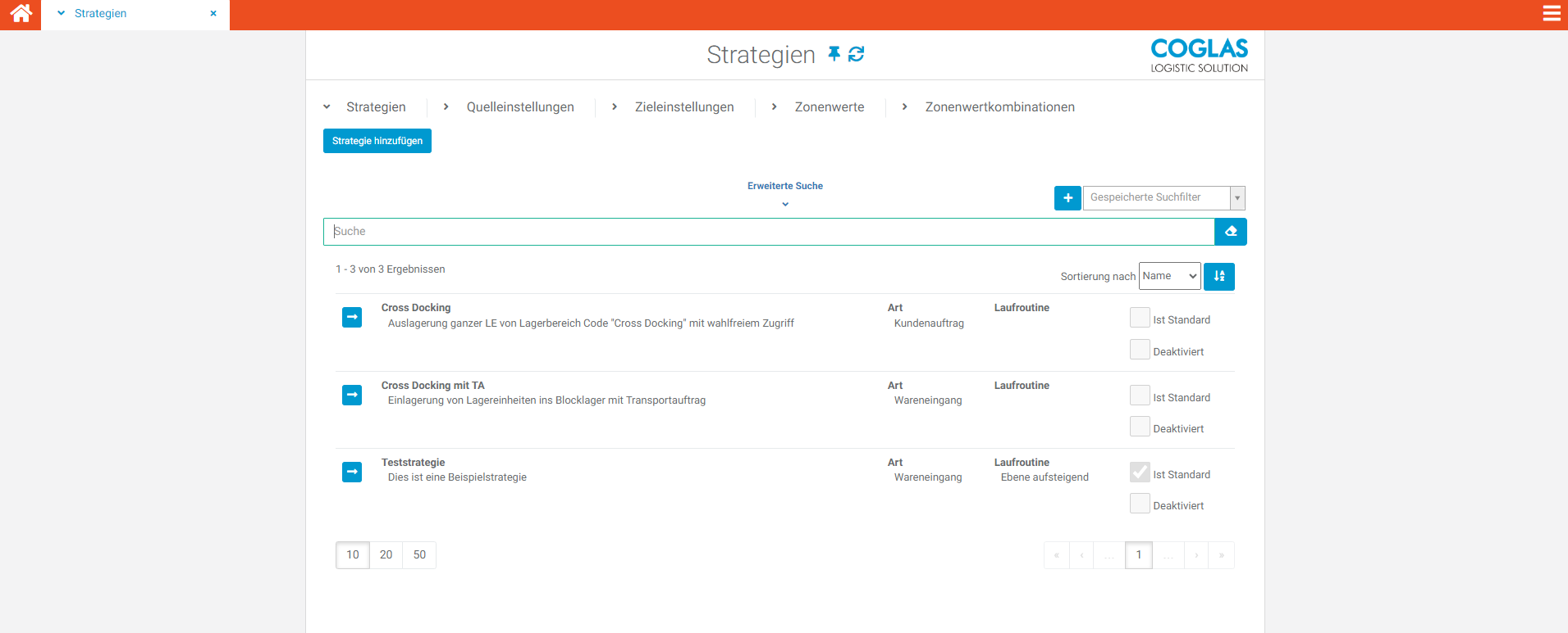 Die Strategie im COGLAS definiert die Warenfluss Steuerung. Jede Strategie kann n Strategie Positionen erfasst bekommen. Jede Strategie Position enthält Einstellungen zur Quell- und Zieleinstellung für die Lagerplatzsuche. Die Artikel können entweder manuell oder über eine Schnittstelle hinzugefügt werden.