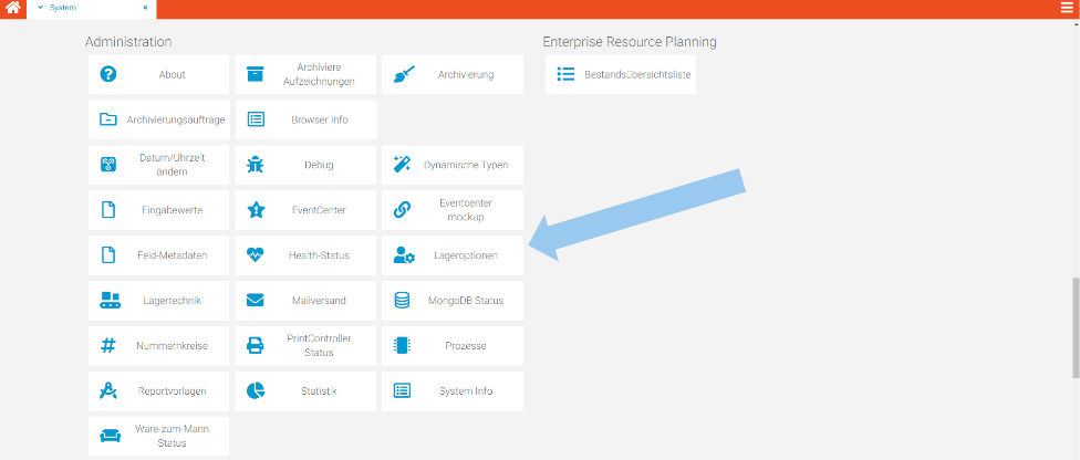 | 2 | Wählen Sie entweder aus dem Reiter Administration oder nutzen Sie die Suchleiste, um „Lageroptionen“ auszuwählen. | ![]() |