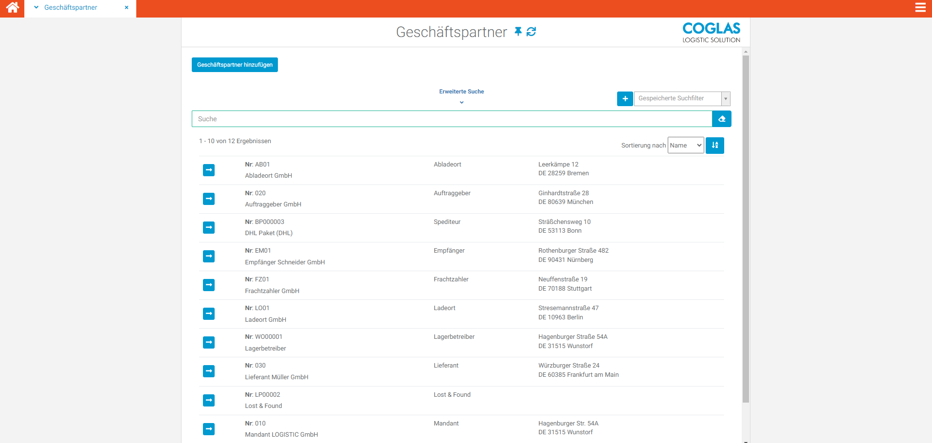 | 6 | Klicken Sie auf „Speichern“, um die Geschäftspartner in COGLAS zu speichern. Diese werden nun in der Liste angezeigt. | ![]() |