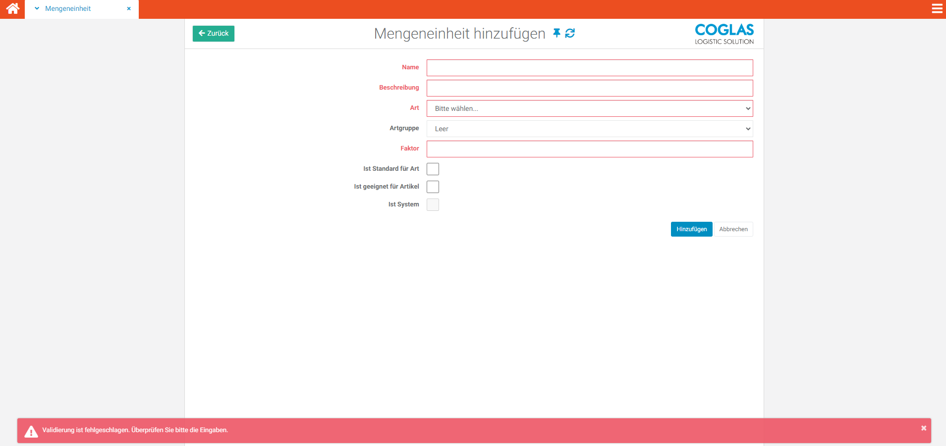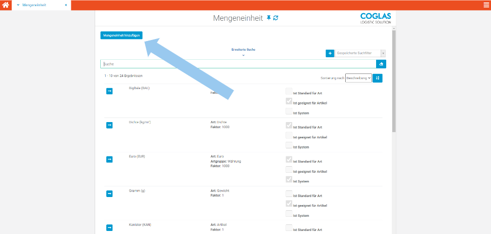 | 6 | Klicken sie auf „hinzufügen“, um die Mengeneinheiten im COGLAS zu speichern. Diese werden nun in der Liste angezeigt. | ![]() |