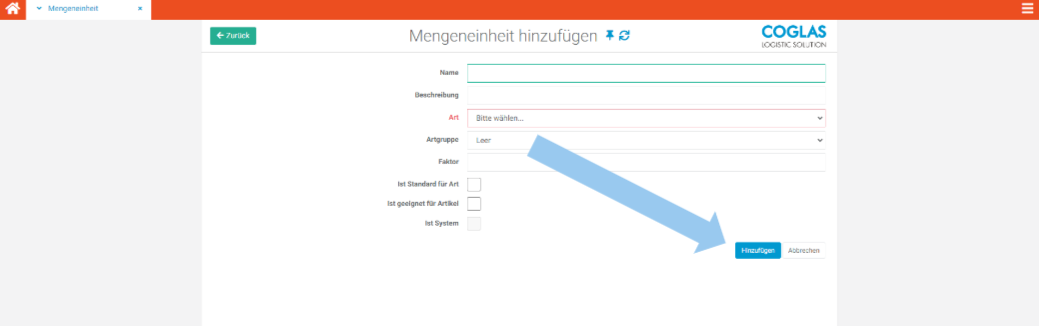 | 4 | Sie befinden sich nun in der Ansicht „Mengeneinheit hinzufügen“. | ![]() |
