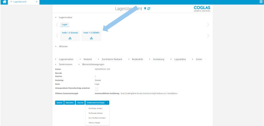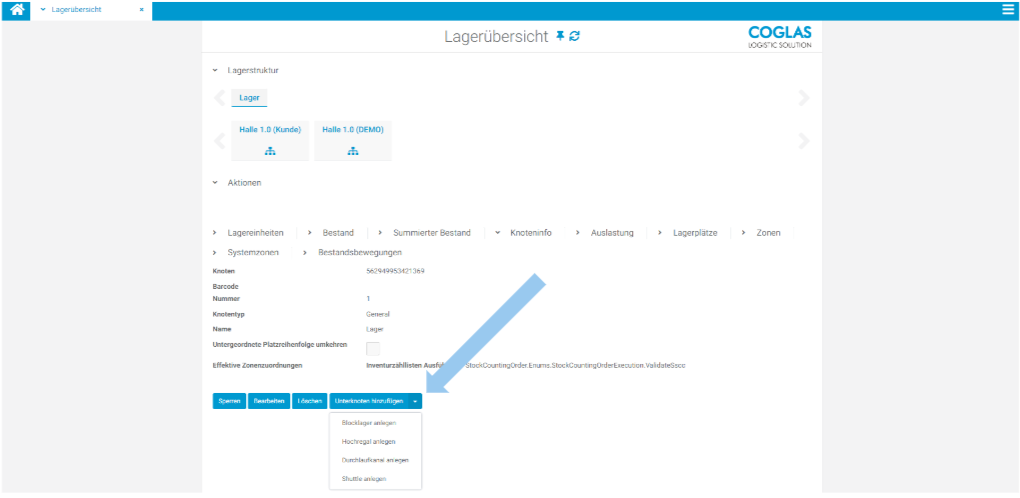 | 4 | Wählen die die Pfeiltaste neben dem Menüpunkt “Unterknoten hinzufügen” um die Dropdown liste zu aktivieren Nun können Sie eine Auswahl treffen welche Lagerart Sie anlegen möchten | ![]() |