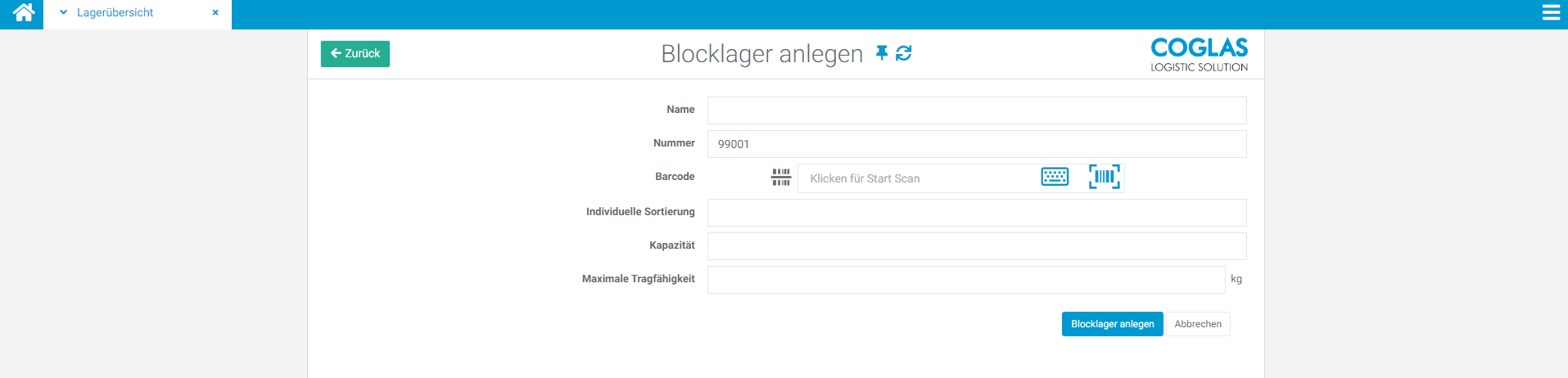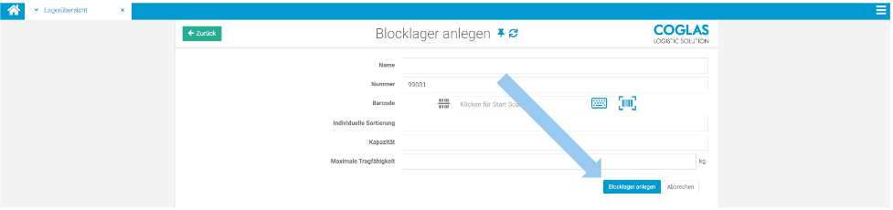 | 7 | Klicken sie auf „Blocklager anlegen“, um den Lagerplatz im COGLAS zu speichern. | ![]() |