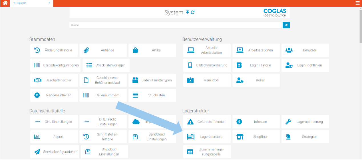 | 2 | Wählen Sie entweder aus dem Reiter Lagerstruktur oder nutzen Sie die Suchleiste, um „Lagerübersicht“ auszuwählen. | ![]() |
