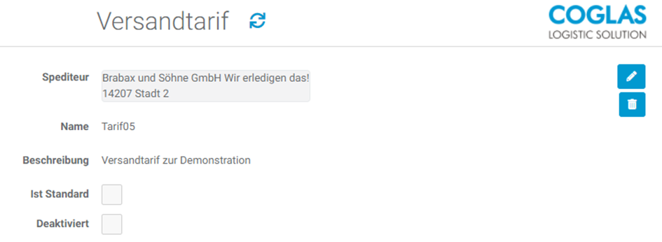 Unter Versandtarif können die mit dem Spediteur vereinbarten Versandkonditionen / Tarife hinterlegt werden. Diese werden dann im Kundenauftrag nach Auswahl des Spediteurs angeboten.