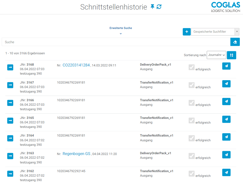 Die Schnittstellenhistorie protokolliert die Kommunikation des COGLAS Web WMS mit über COGLAS Nachrichtentypen verknüpften Systemen.